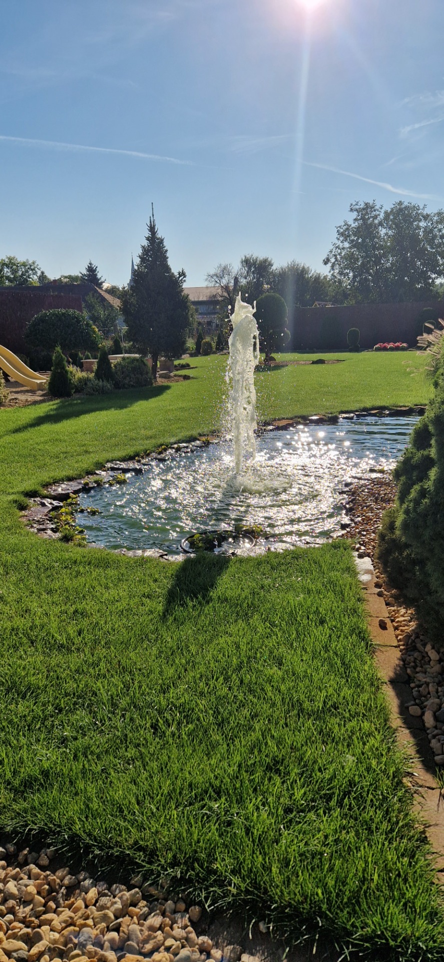 A vállalható munkák közé tartozik továbbá kerti tavak vízesések, szökőkutak és kertitó szűrő rendszerek kialakítása. Egy gondosan megtevezett szökőkút nemcsak karaktert ad a tónak, hanem különleges hangulatot teremt, amelyet az egészséges, ápolt gyep tesz teljessé.