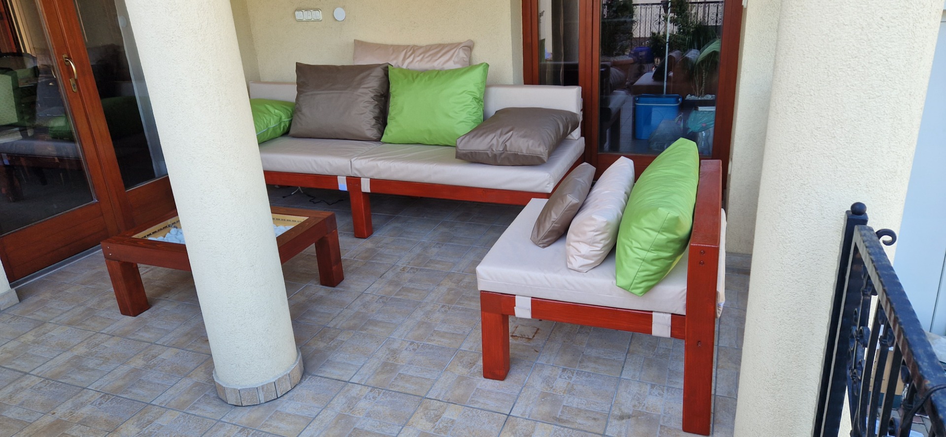 A felhasznált szövet a kültéri bútorhoz, vízlepergető és UV álló.