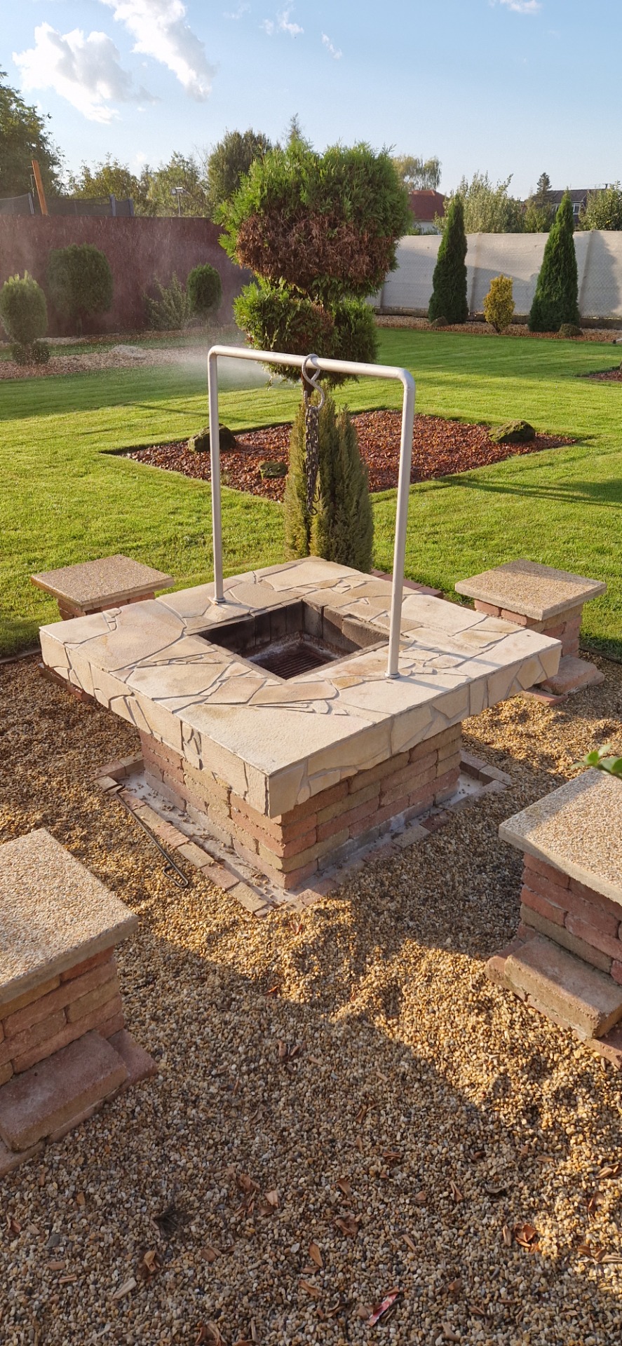 Az főzőhelyiség területén apró szemű kavics alatt szövet van leterítve, hogy a gyomosodást meggátoljam a főzőhelyiség területén. A főzőhelyiség alapja 25 cm bevasalt beton, 8 mm átmérőjű betonacél használatával valósul meg.